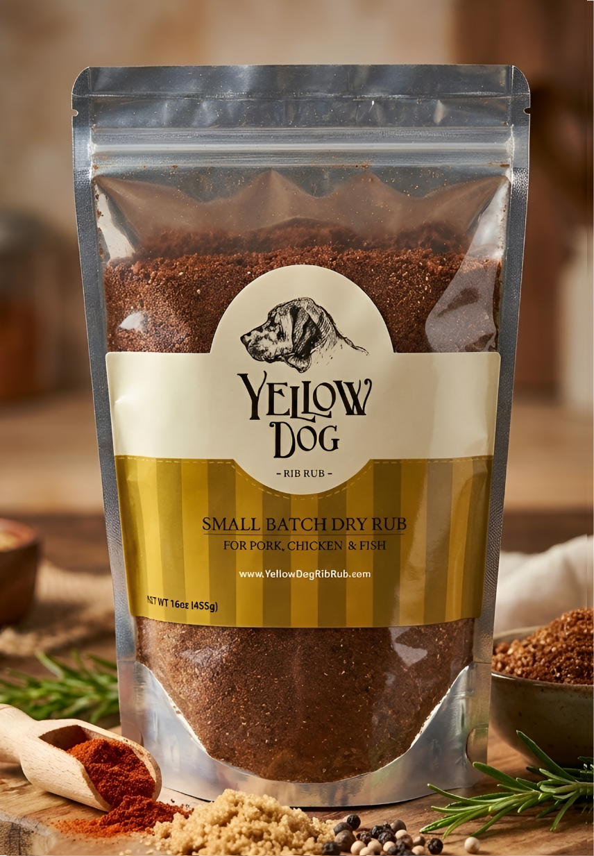 Hundreds of batches later, we landed on the formula that would become Yellow Dog Rib Rub โ named after our loyal yellow lab, Buddy, who never missed a single cookout in his 14 years.